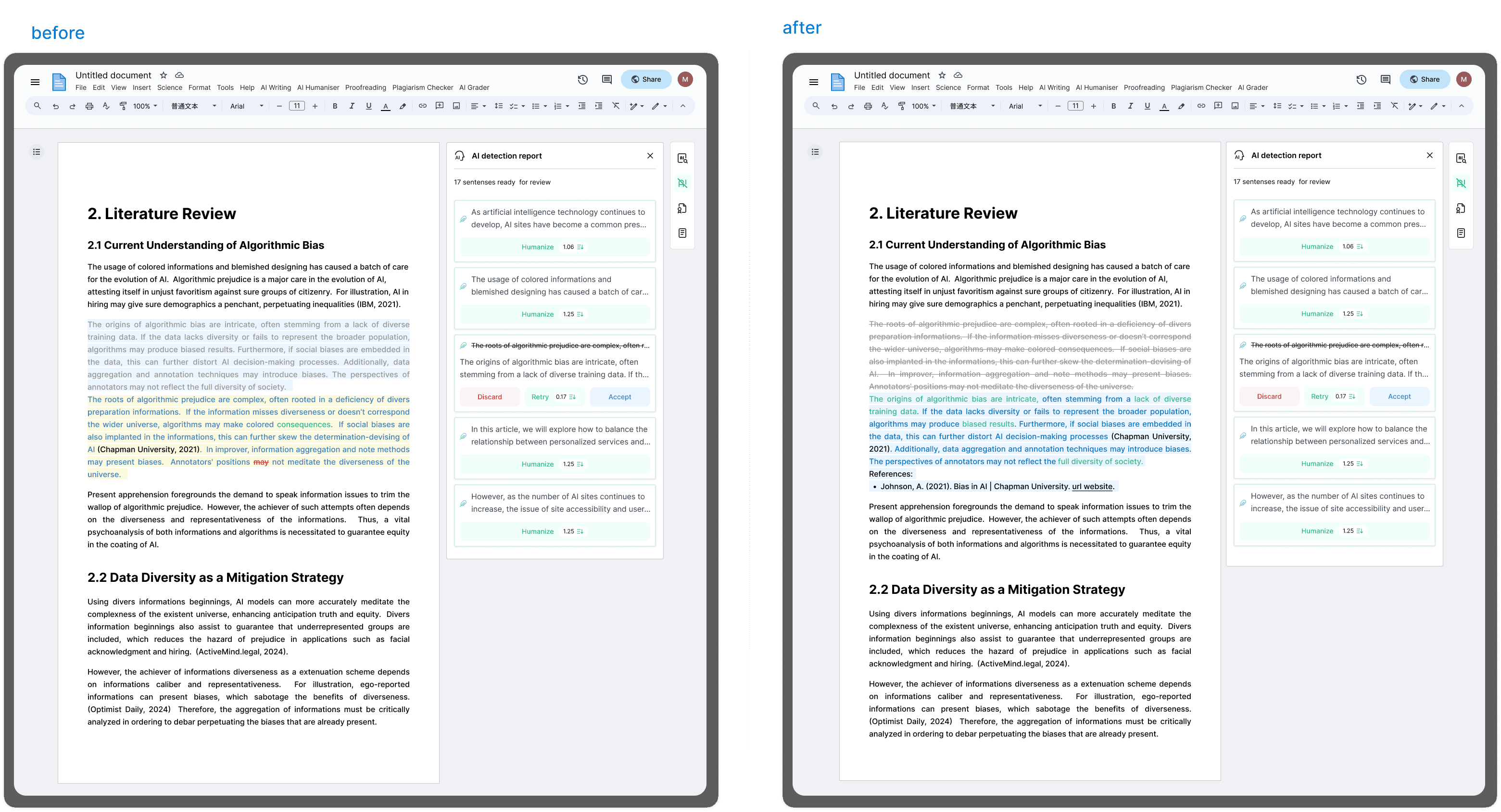 Beyond visual clarity, I streamlined the academic workflow through automated citation linking. Previously, inserting a citation felt like a "dead end"—there was no immediate system feedback or active connection. I redesigned this interaction to be proactive: the system now fetches and links references instantly upon insertion. By replacing manual effort with system automation, I not only reduced the user’s cognitive load but also ensured the integrity and accuracy of academic references within the document.