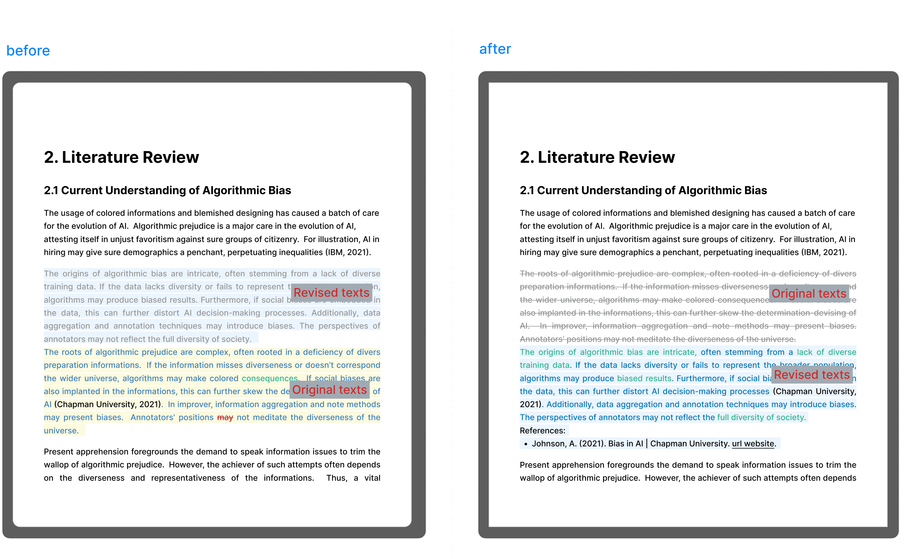 To resolve this, I prioritized visual hierarchy and content isolation. By moving heavy editing markers and strikethroughs out of the main body, I allowed the document to "breathe" again, shifting the user's focus from the editing process back to the content itself. For current revisions, I introduced a subtle blue highlight that maps directly to the "Accept" action, establishing a clearer link between visual changes and user intent. This transition from complex, mixed-state display to a streamlined, intent-focused view significantly accelerated the revision cycle.